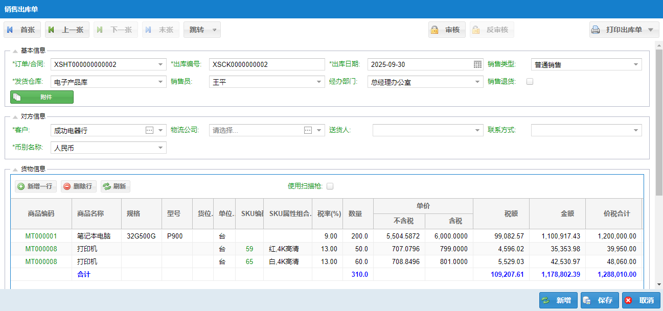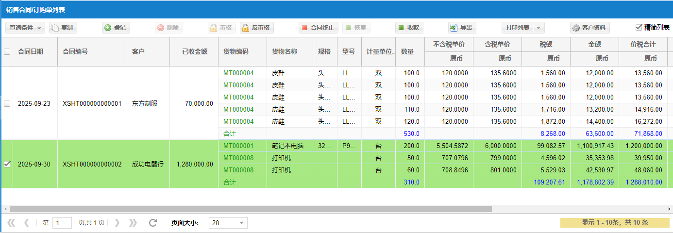 【审核/反审核】 → 确认无误后即可审核,审核后合同/订单才能被销售出库单引用和收款操作;