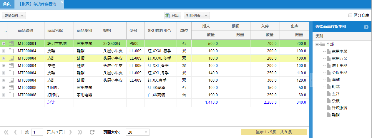主要统计各组商品期初、期末,以及本(查询)期入库、出库的数量与成本金额。