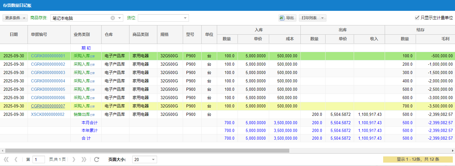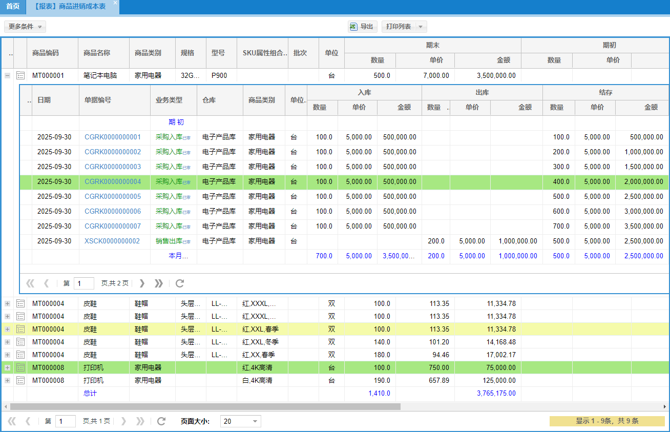 点击左侧+号,可以展开查看当前商品出、入库和结存成本明细账。