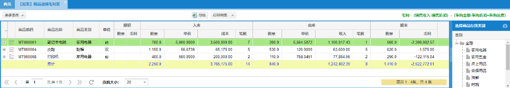 主要统计商品采购入库、销售出库产生的采购成本、销售收入和销售毛利情况。