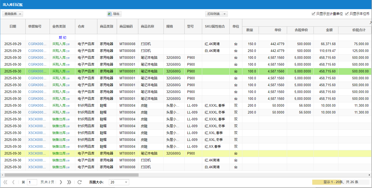 列示商品基本信息、出入库对应的单据编号(点击编号可以打开对应的单据信息)、 出入库数量、单价、金额以及对方单位。
