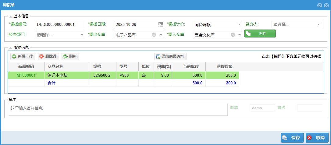 操作:先选择调出仓库然后选择调入仓库,点击商品编码单元格可以选择相应商品信息。
