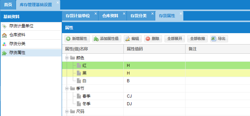 这里主要初始设置库存管理基础参数:存货计量单位、仓库资料、存货分类以及存货SKU属性名称和属性值。