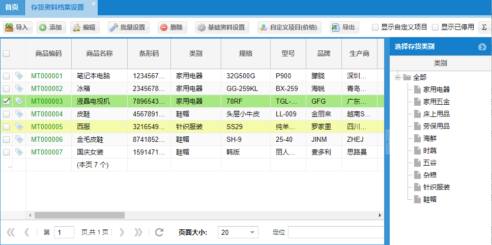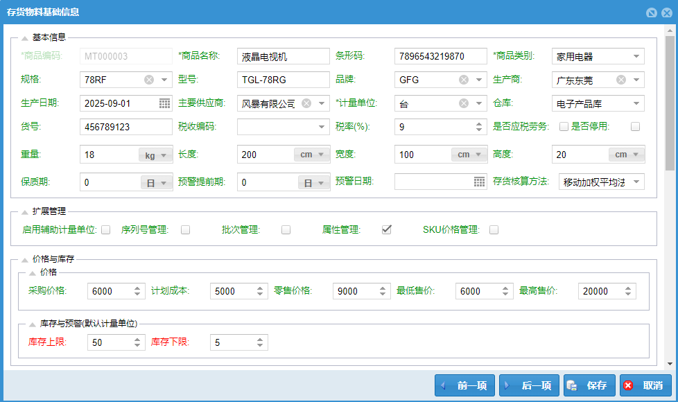 这里预先录入商品存货的基础信息:编码、名称、条码、分类、生产信息、品牌信息、尺寸、计量单位、税率、预警信息、属性信息、价格信息等等。 项目的下拉菜单【删除】即可删除该项,如果该项目已经用于工资统计则不能删除。