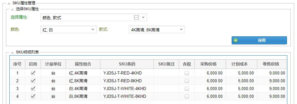SKU属性以及各属性对应的属性值