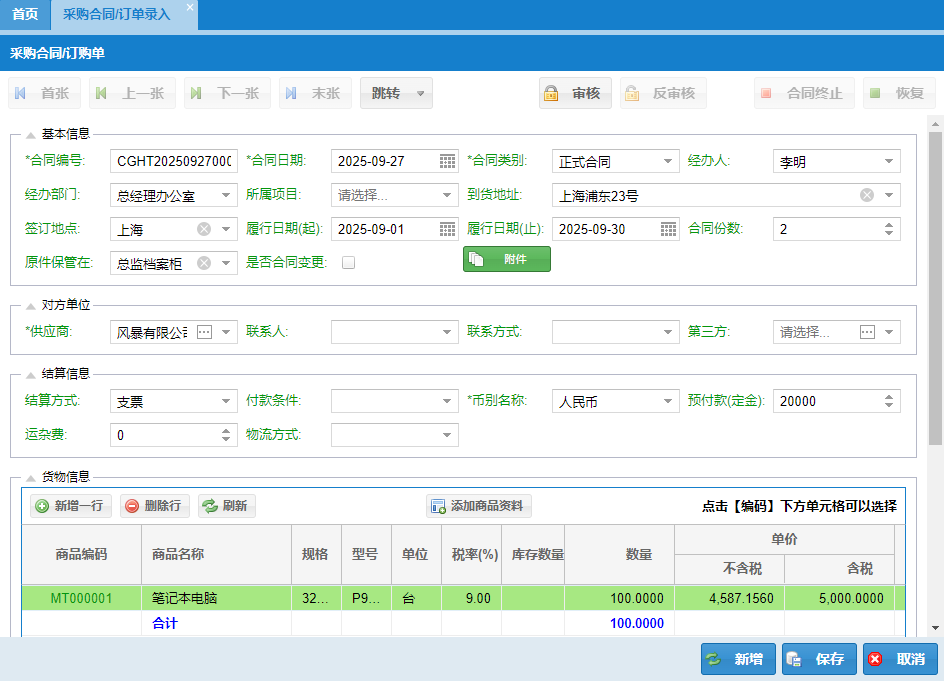 【审核/反审核】 → 确认无误后即可审核,审核后合同/订单才能被入库单引用和付款操作;