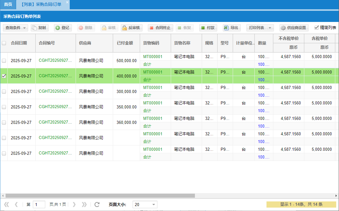 ②【列表】采购合同/订单 → 查询条件 → 登记/复制/删除单据 → 审核/反审核 → 付款